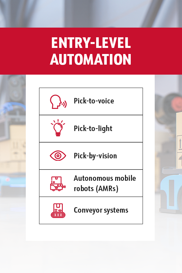 Entry-level automation is a technology that works with staff during the picking process. It doesn’t replace labor entirely, but assists staff in repetitive tasks to help increase accuracy and efficiency. Entry-level automation is ideal for warehouses that want to improve their performance without investing in a fully automated infrastructure.