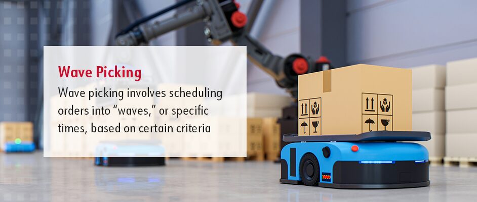 Wave picking involves scheduling orders into “waves,” or specific times, based on certain criteria like shipping deadlines or routes. This method can help balance workloads and reduce bottlenecks, especially during peak hours, to ensure timely shipments.