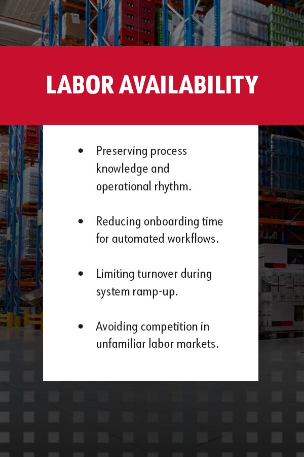 Analyze how your operations balance cost exposure, disruption tolerance, speed requirements, labor stability and physical growth limits. These four factors determine whether automation will work within your current building or if a new facility is the only viable option.